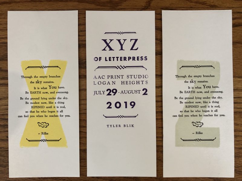 You can see why I was looking forward to once again turning back the clock and setting type and printing broadsides throughout the summer of 2020 at the Print Studio together with my friend Patricia Cué, who also serves on the San Diego Design Week steering committee. Our plan was to organize an exhibition in the gallery at the Athenaeum Art Center together with Sibyl and during San Diego Design Week showcase work produced at the Print Studio.