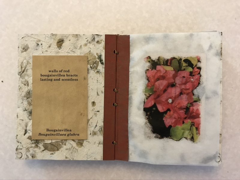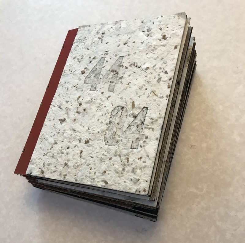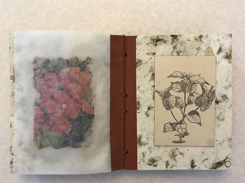 “Beyond Black-and-White, Dyeing for Color” was the last class I took before the Print Studio closed due to the pandemic. The goal was to create dyes from nature. I took the project a step further and created both dyes and paper from plants that grow in my own yard, thirteen in all. The results were divided into two books called 4484 and 4484 TOO with a sequence of four pages devoted to each plant. The first page features a poem or phrase on paper colored with dye from the plant, which is mounted on handmade paper made from the same plant. A color photograph of the plant printed on translucent vellum follows and the last page shows either an old wood engraving of the plant or, if that was not available, a photograph that I modified in PhotoShop to look like a mezzotint. The title on each book cover was printed using 72-point Garamond wood type. During the process, I made a lot of sample dyes and many sheets of handmade paper. I’m still exploring ways to make use of these materials.