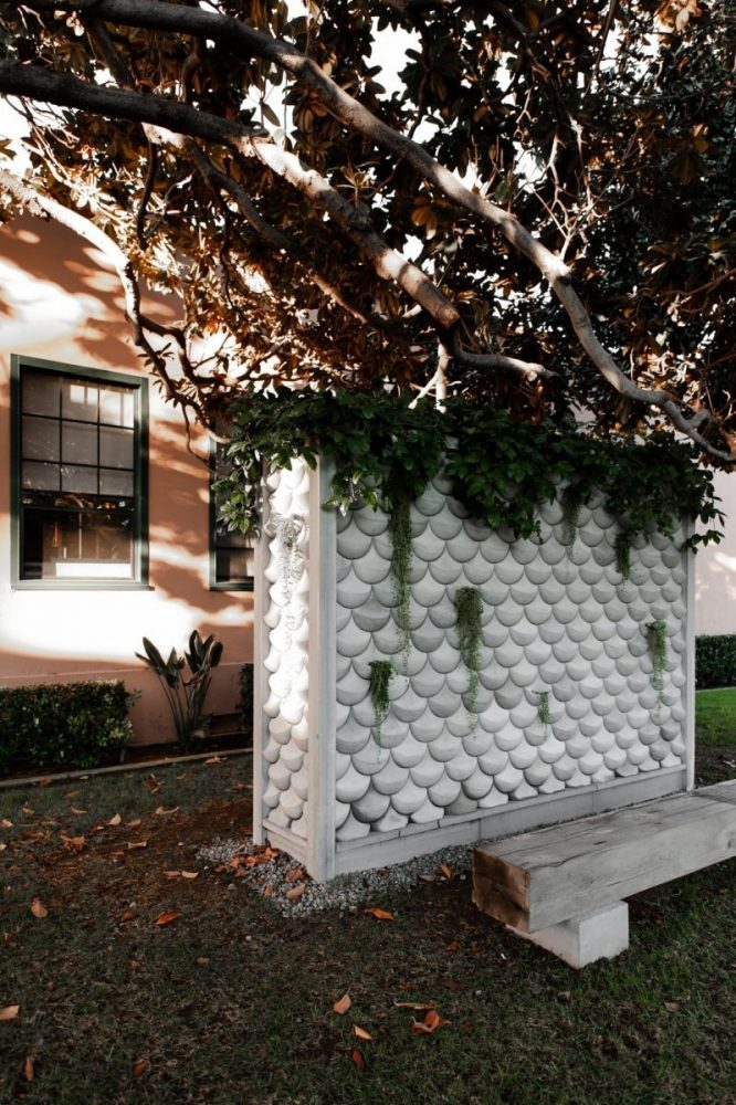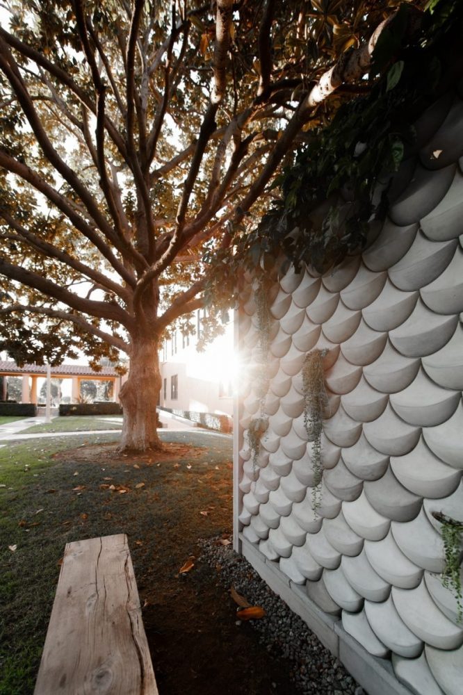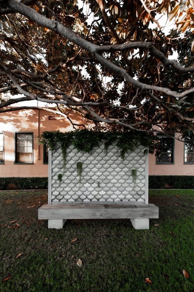 Situada a la sombra de dos magnolios, la instalación escultórica, en palabras de Jason, proporciona un lugar contemplativo para simplemente estar, experimentando el juego de la luz, el clima y el tiempo. El banco de vigas de madera pesada habla de la gran construcción original del techo de postes y vigas de Liberty Station de los años 20 y de la tradición del carpintero en el legado de la construcción naval.