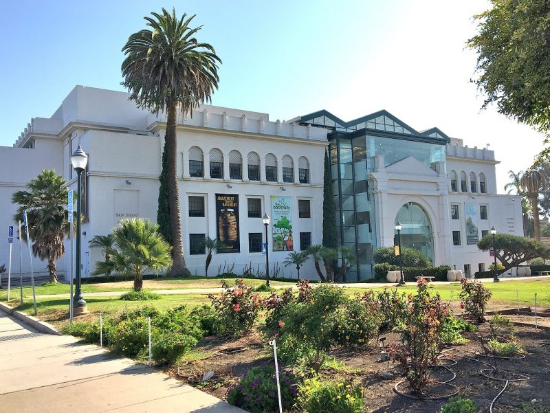 The San Diego Natural History Museum, dedicated on January 14, 1933, was designed by William Templeton Johnson who is best known for his Spanish-Revival architecture. Johnson’s interest in Spanish architecture solidified with the popularity of the Panama-California Exposition, according to Sarah J. Schaffer in “A Civic Architect for San Diego.” Schaffer also points out Moorish influences in Johnson’s design of the museum façade, such as the succession of ten arches on either side of the entry and a decorative geometric pattern of yellow and blue tiles under each window. These colors relate back to the dome on the California Building and provide a sense of continuity.