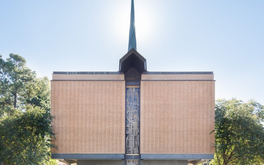 Probablemente haya pasado cientos de veces por esta iglesia situada en una loma con vista a la autopista. La espectacular línea curva de su techo y su color marfil son ciertamente fáciles de identificar. Pero el verdadero placer está en el interior, donde, al final de la tarde, puede uno disfrutar de un hermoso espectáculo de luces de los vitrales dorados.