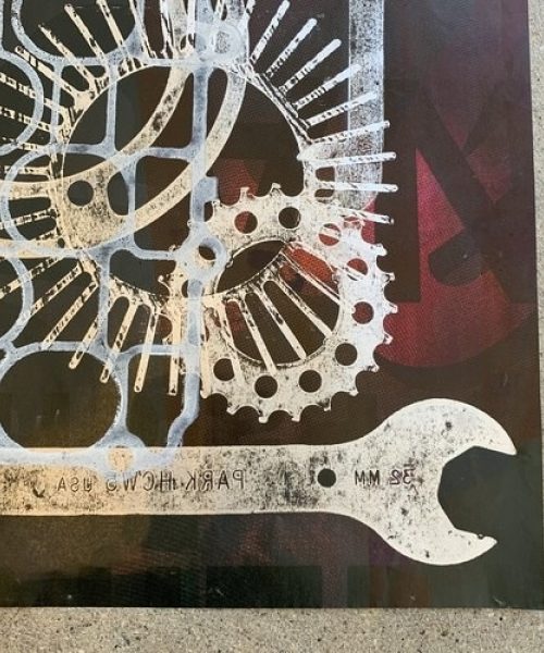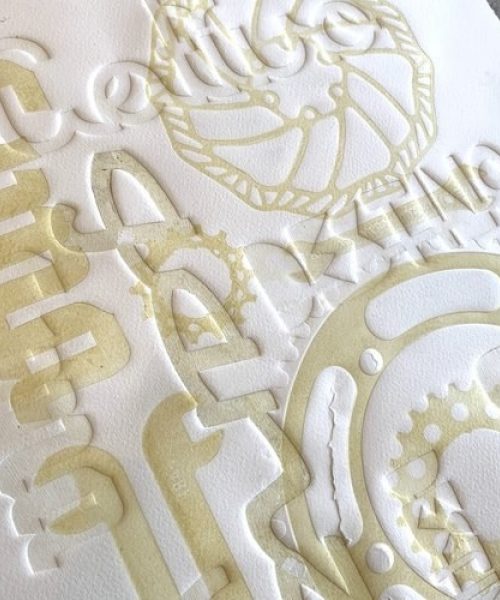 Ron: I have a lot of interests and like to search for unusual combinations or collisions that might have potential. For example, I collect tools and mechanical parts, like gears, for their interesting patterns and shapes. I had several ideas that I wanted to test using the parts I collected and combining monoprints, or one-offs, of the parts with wood type. I call these “parts prints.” After the prints dried, I set up pieces of wood type on the letterpress bed using magnets to hold the type in place and overprinted the type onto the parts prints. I also experimented with printing on old maps and other printed pieces from my archive, which created unexpected interactions between the layered imagery. Sometimes I didn’t use ink at all but embossed the parts, which left surprising shapes indented into the paper.