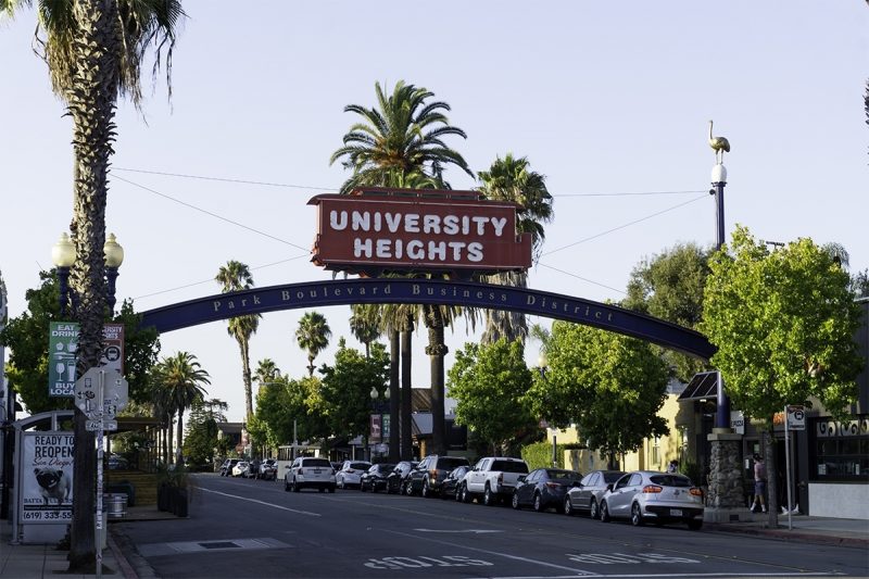 Park Blvd. was once an electric street car route, along its path from downtown to Adams Ave. The University Heights neon sign pays homage to those days. Large gold leaf ostriches, reminiscent of the old ostrich farm that was once at the north end of Park Blvd., sit atop the supporting posts.